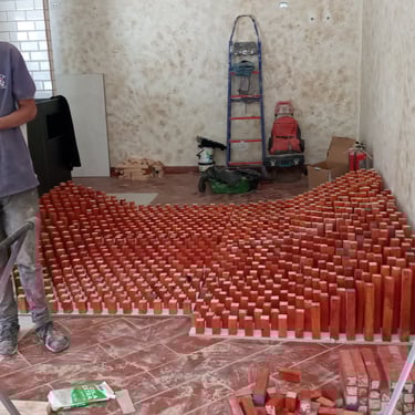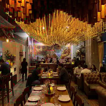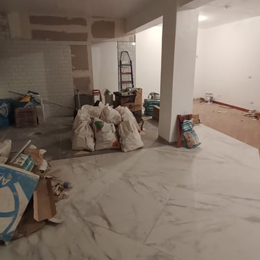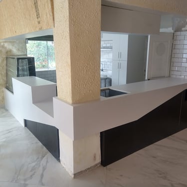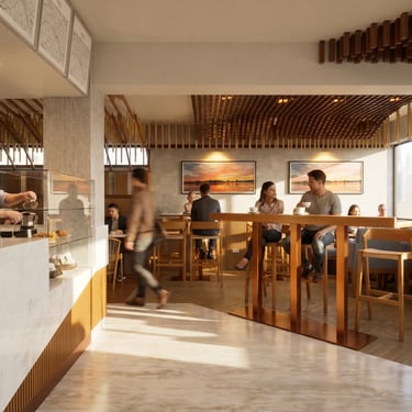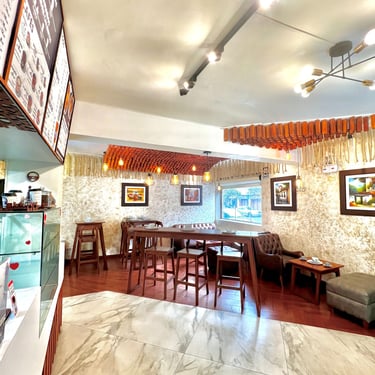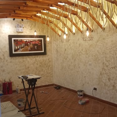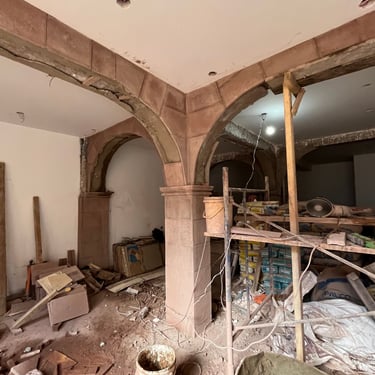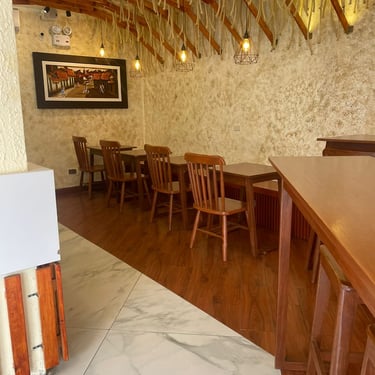 Esculpimos arcos con picapedreros locales para dialogar con la casona original. Diseñamos mobiliario modular para adaptar el salón a diversas funciones (buffet, eventos) y reutilizamos las mesas de mármol del cliente para ahorrar costos.
