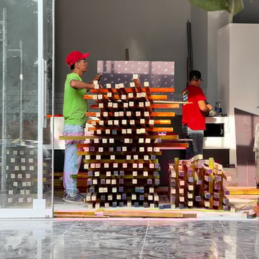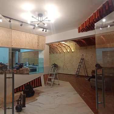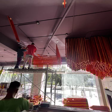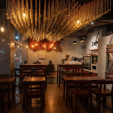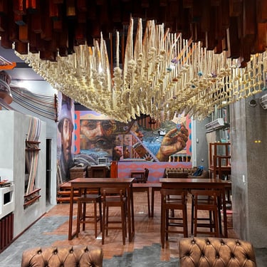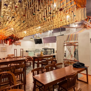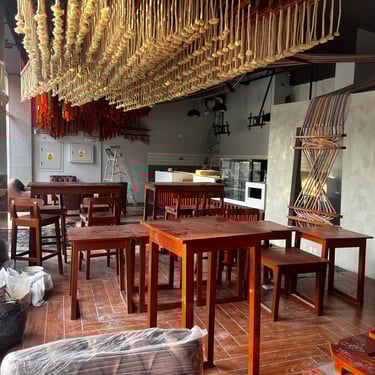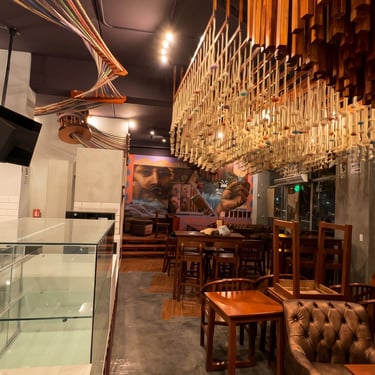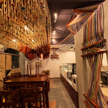 Ejecutamos la obra en solo 3 semanas. Fusionamos el diseño arquitectónico con un mural del artista "Decertor". Usamos techos dinámicos para jugar con las alturas y zonificar, e instalamos un gran "ovillo" central con telares que simboliza el almacén como el corazón del local.