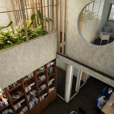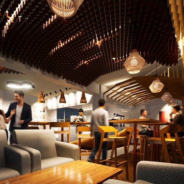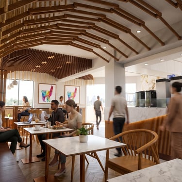 Zonificamos el espacio usando techos de madera inspirados en la geometría andina. Estos delimitan visualmente las áreas y eliminan el eco. Complementamos con texturas de piso para guiar la circulación fluidamente.